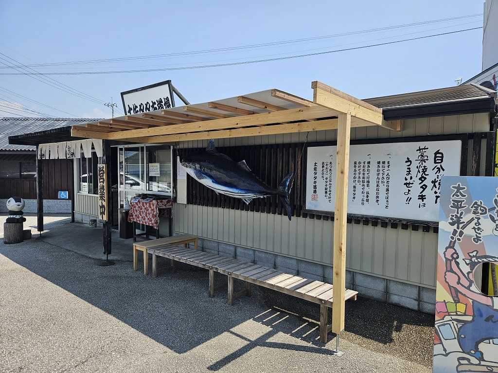 途中、レストラン「かつお船」横の「土佐タタキ道場」で、タタキ定食をいただきました。ここでは、生の鰹を、藁で焼く体験ができます。