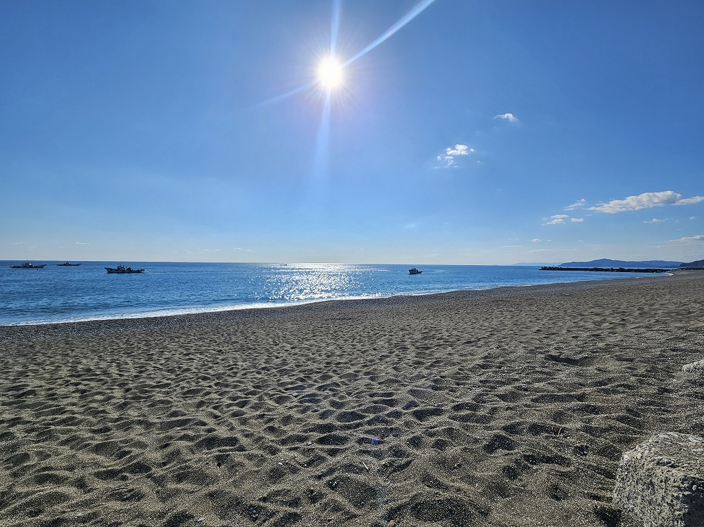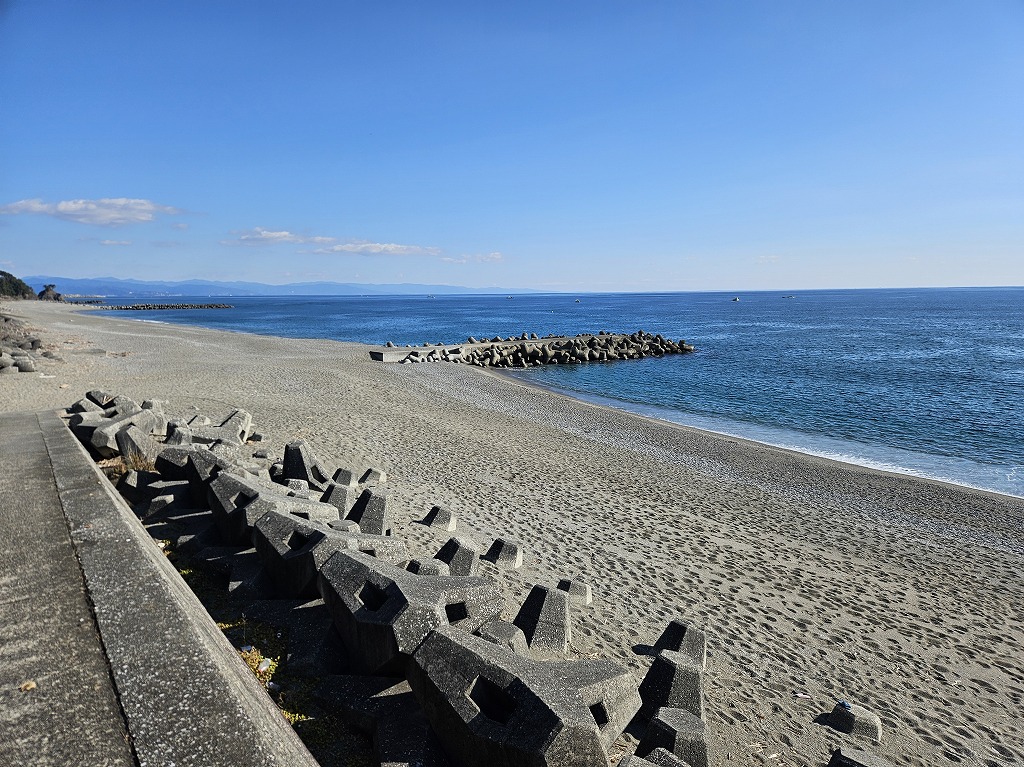このあとは、一番の目的である太平洋を見ることができる砂浜を目指し、「桂浜花街道」を走り、いつもの場所にバイクを停めて、砂浜に降りました。