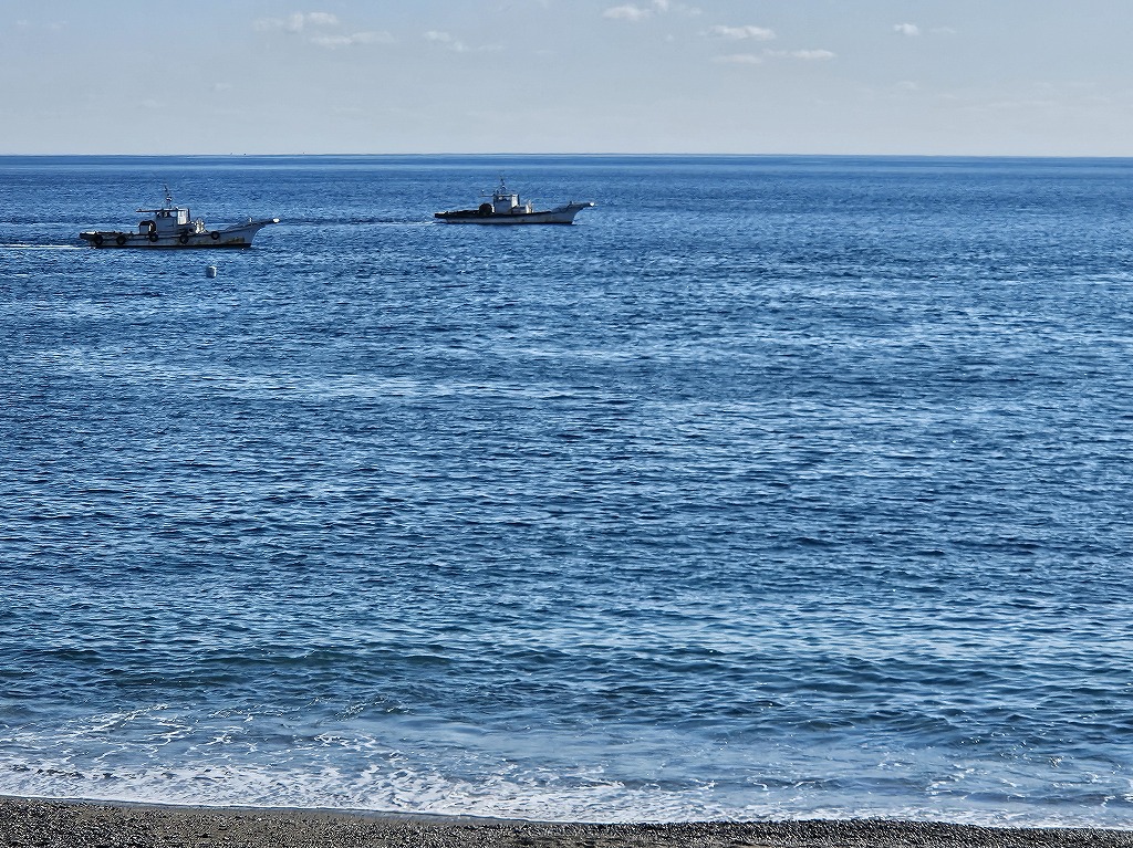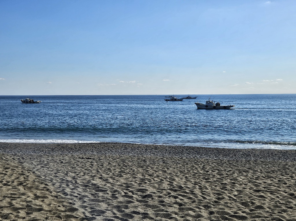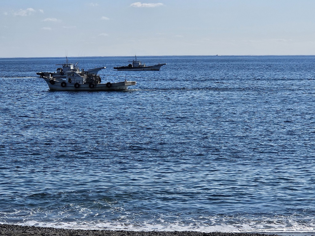 砂浜に降りると、数隻の漁船が網を曳いているようでした。ひょっとしたら、底びき網漁法(2艘びき)かもしれません、、、(?_?)そうだとしたら、初めて目の前で見ることができました。ワクワク、ドキドキです!!!